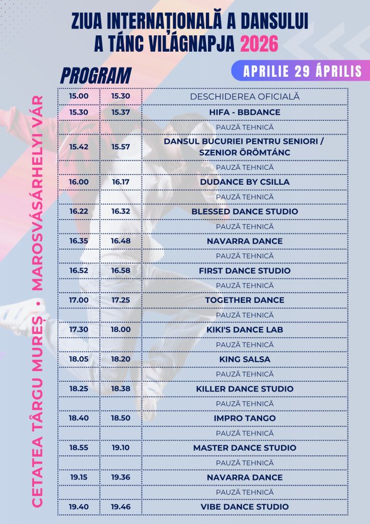Centrul de Cultură, Artă și Agrement Târgu Mureș invită publicul miercuri, 29 aprilie 2026, între orele 15.00 – 22.00 la Amfiteatrul Borsos Tamás din Cetatea Medievală, pentru a celebra împreună Ziua Internațională a Dansului, printr-un eveniment dedicat mișcării, expresiei artistice și bucuriei de a dansa.